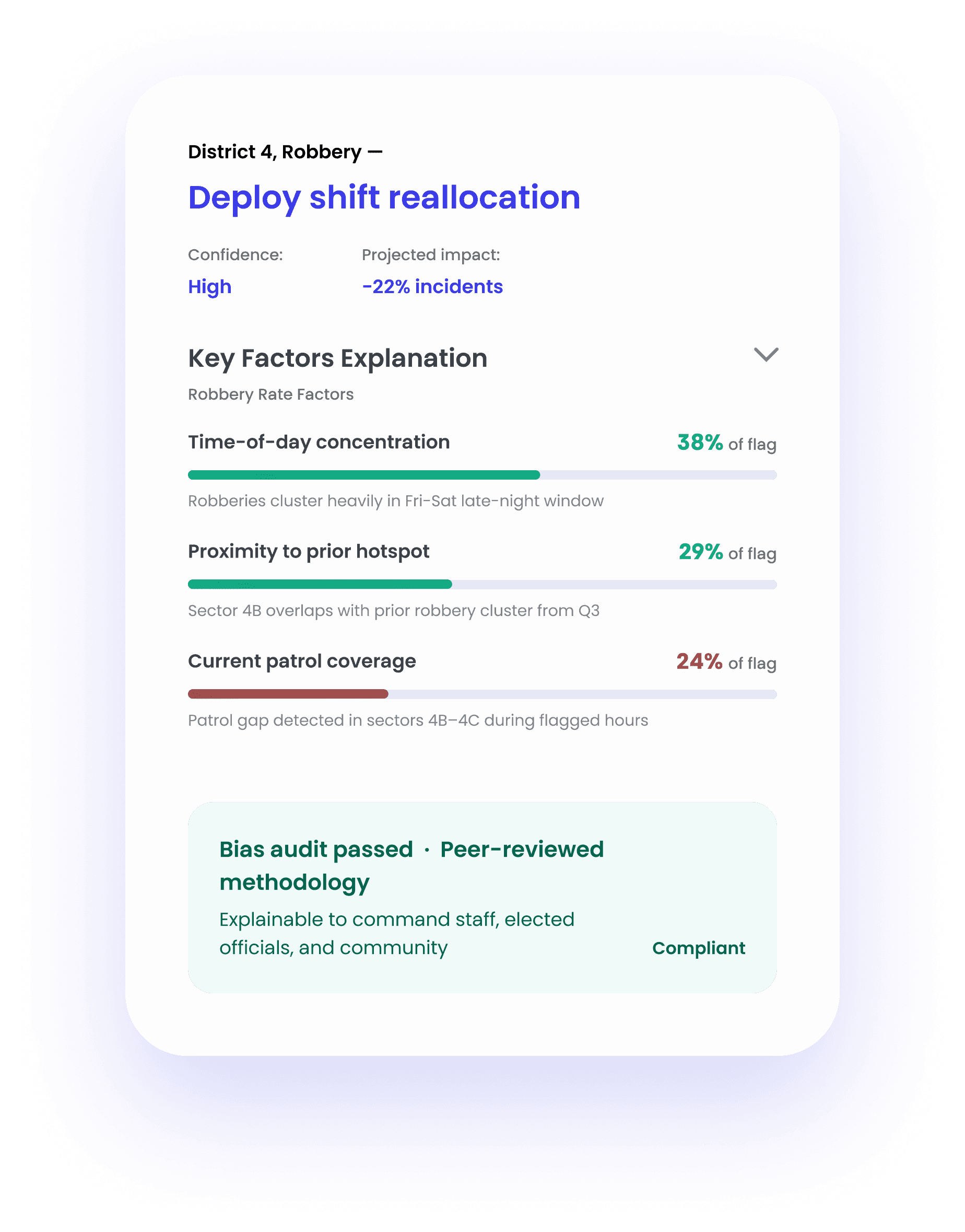 The methodology is causal and explainable. Not a black box. Not a dashboard. Intelligence your command staff can act on, your leadership can defend, and your community can trust.